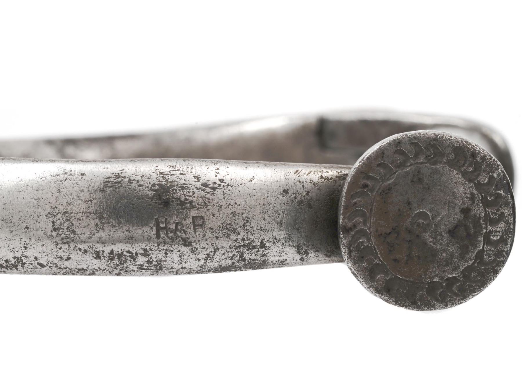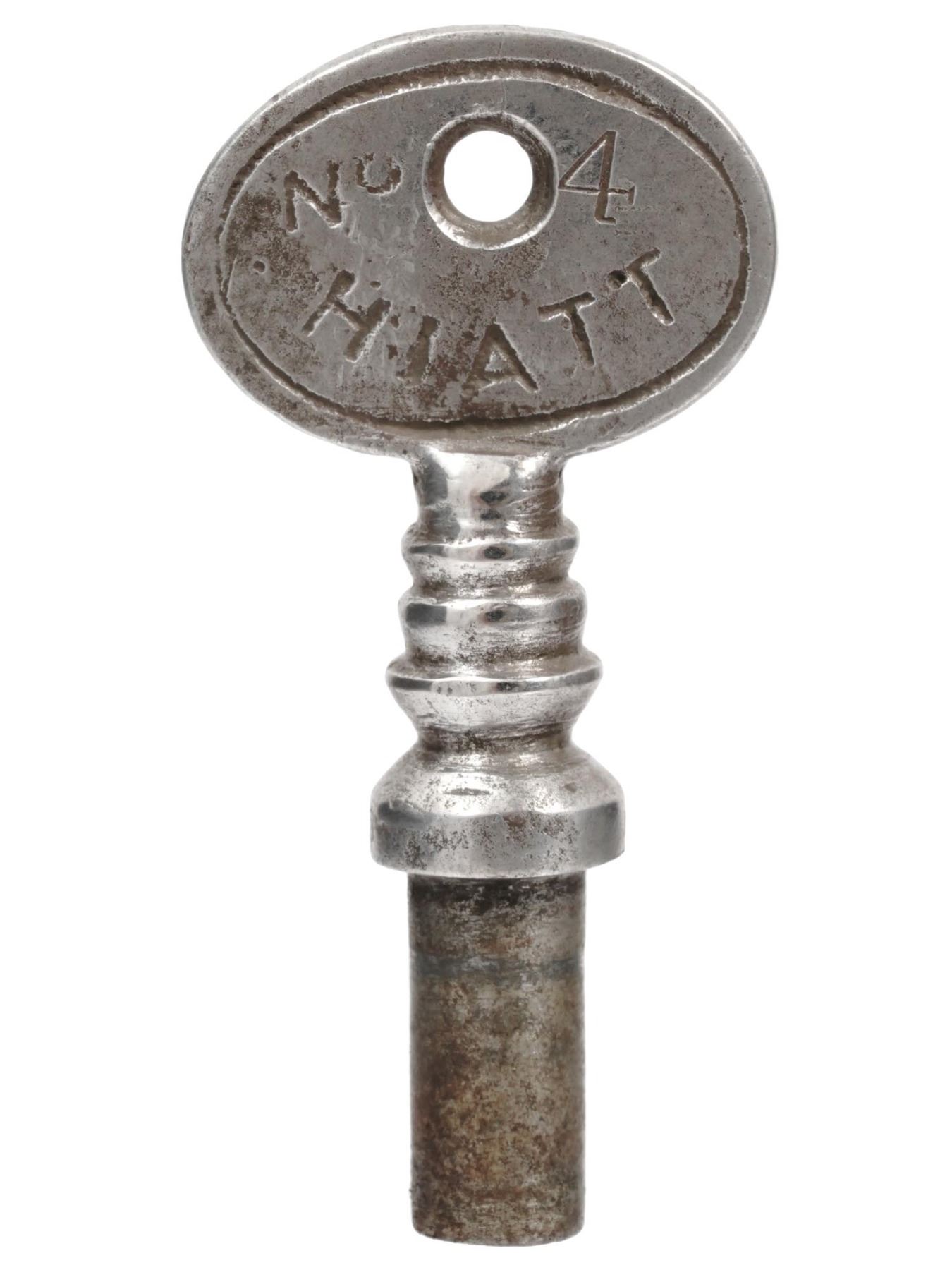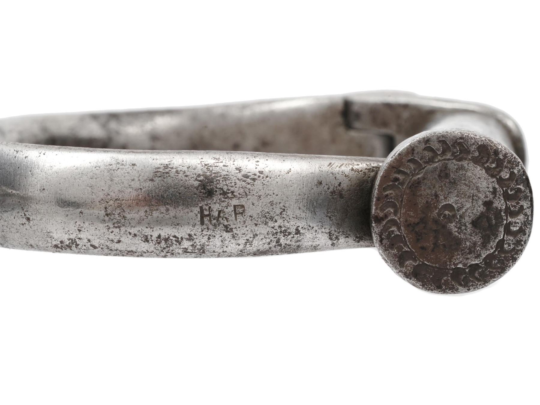 Hiatt steel handcuffs with broad arrow mark, stamped "Hiatt, Warranted, Wrought, Hard", # 4, with original key stamped "HIATT # 4".