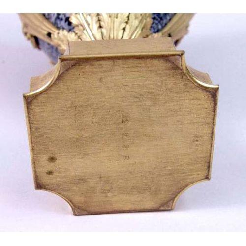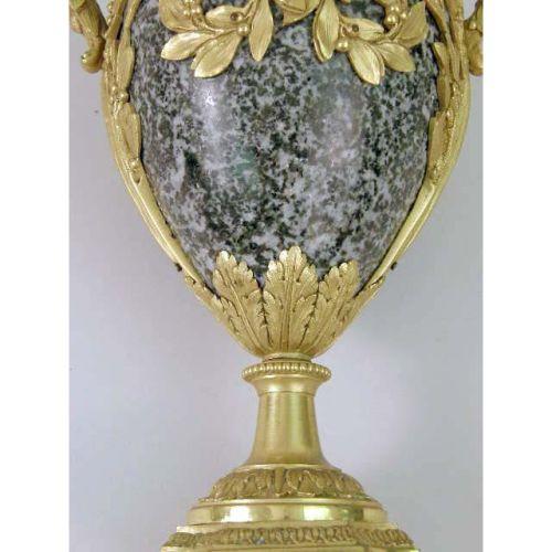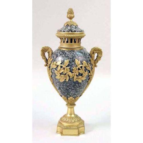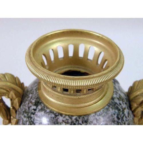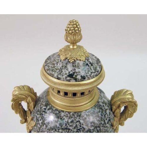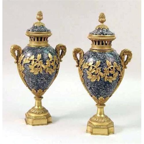 A PAIR OF HARDSTONE ORMOLU- MOUNTED URNS<BR><BR>having a foliate motif, numbered 2286, losses, wear, 11-1/4"h