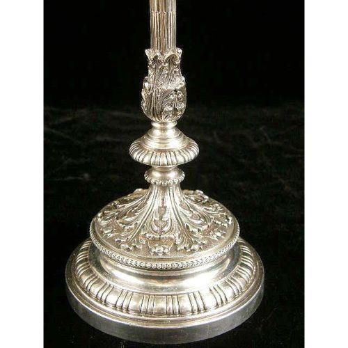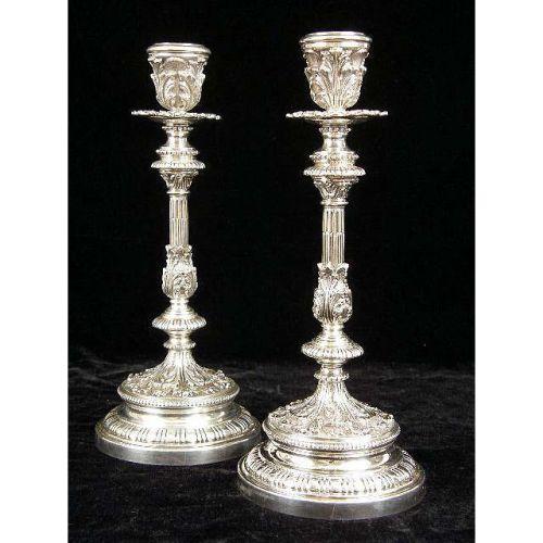 A PAIR OF HIGHLY ORNATE BUCCELLATI, ITALY STERLING SILVER ACANTHUS MOTIF CANDLESTICKS<BR><BR>On circular bases, each 9-1/2"high, total weight apx. 40 T.O.