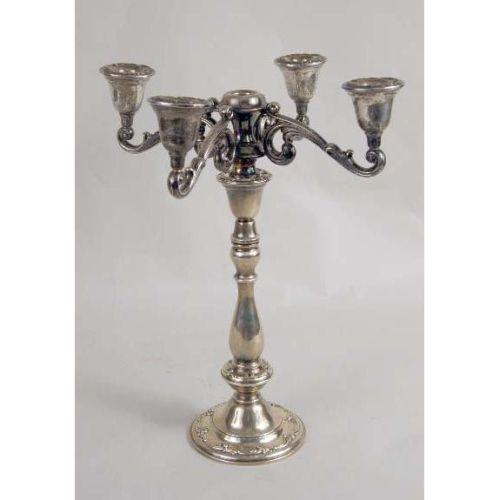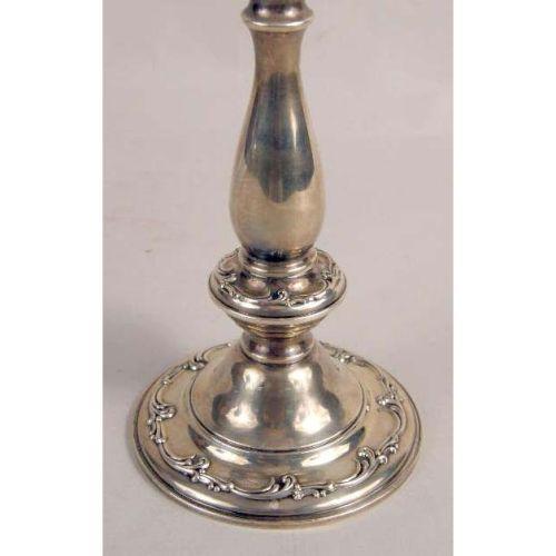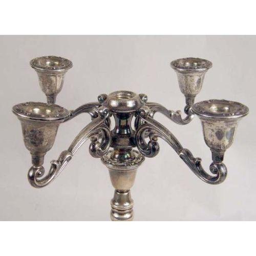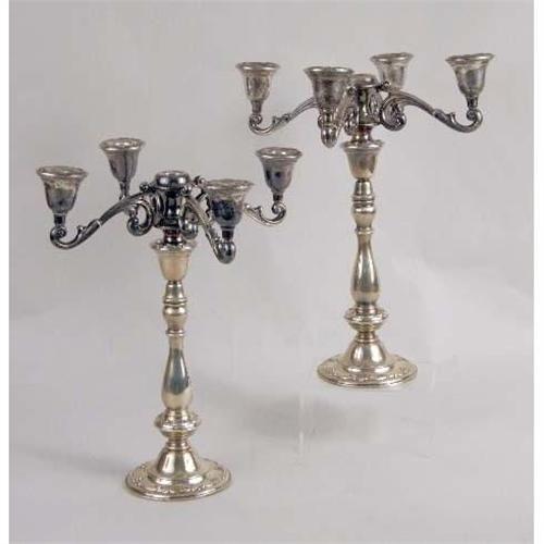 A PAIR OF INTERNATIONAL WEIGHTED STERLING SILVER CANDLESTICKS WITH DETACHABLE FOUR-BRANCH CANDELABRA TOP<BR><BR>Vasiform with scroll-decorated borders on circular rim foot, candlesticks, 10-1/2"high, with candelabra, 13-1/4"high