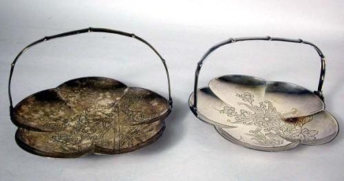 A PAIR OF JAPANESE SILVER HANDLED DISHES; One engraved with cherry blossom and bamboo motif, the other engraved with lotus motif, each 6-3/4"dia.