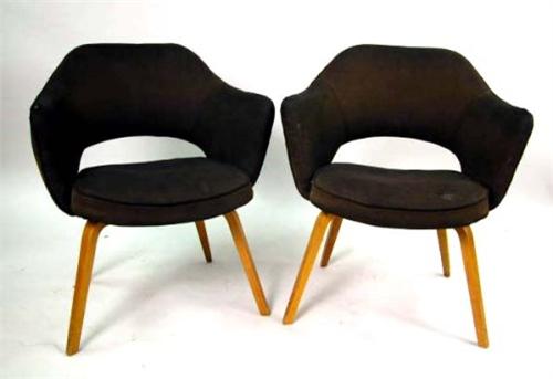 A PAIR OF KNOLL ARMCHAIRS; Open backrest upholstered in brown, unsigned