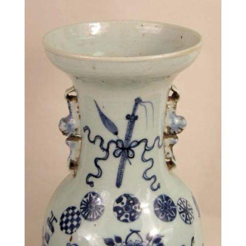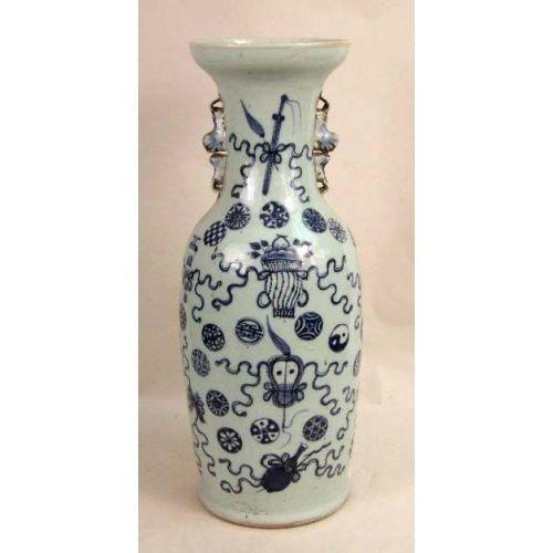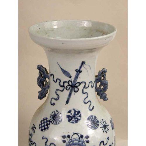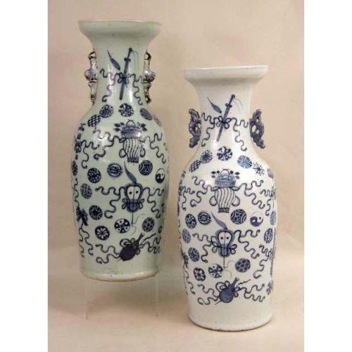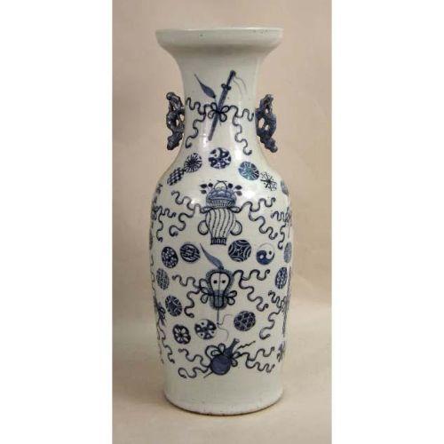 A PAIR OF LARGE CHINESE BLUE AND WHITE PORCELAIN VASES<BR><BR>decorated with baskets of peaches, symbolizing longevity, gourds, yin-yang symbols and more. One with a handle in the shape of dragons, the other two dogs touching noses. Each 23 1/4" h x 8 1/2" d.