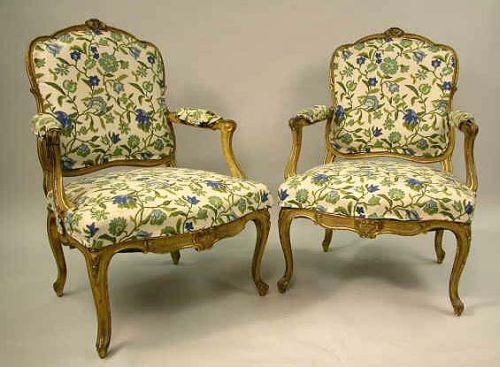 A PAIR OF LOUIS XV STYLE CARVED GILTWOOD FAUTEUIL A LA RAINE; Each with shaped crests and upholstered backrests, continuing to over-upholstered arms, the serpentine-front seat below ending on cabriole legs, wear throughout, including upholstery, 38-1/2"h