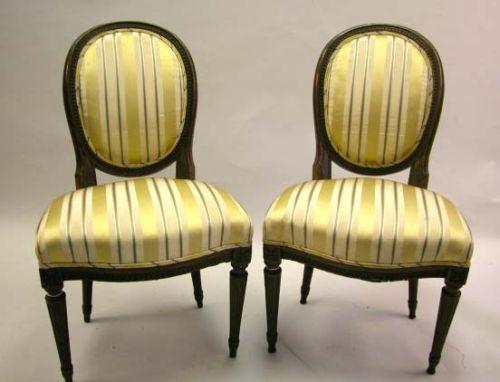 A PAIR OF LOUIS XVI CARVED WALNUT CHAISES; French, each with an imbricated oval back, semi-overupholstered seat and stop-fluted legs, repairs
