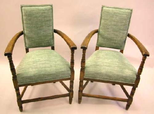 A PAIR OF LOUIS XVI STYLE BEECHWOOD FAUTEUILS; Each with turned legs joined by a box stretcher and peg feet
