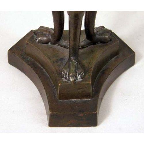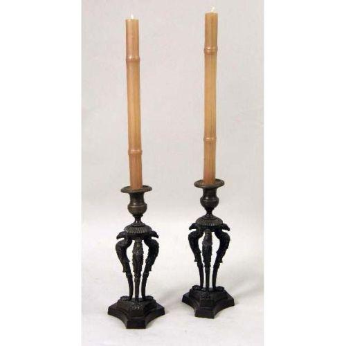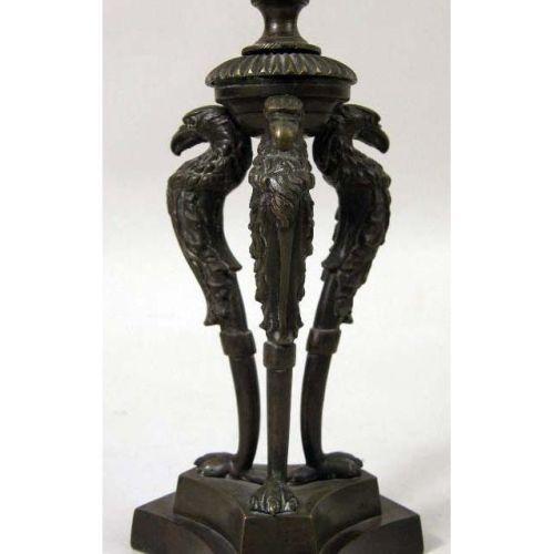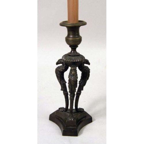 A PAIR OF LOUIS XVI STYLE BRONZE CANDLESTICKS<BR><BR>With eagle decoration on concave-sided triangular base