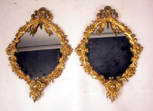 A PAIR OF LOUIS XVI STYLE CAST BRONZE MIRRORS; each oval plate within a leaf, ribbing and diaperwork-decorated frame, (lacking candlearms). 18 1/2"h x 13"w