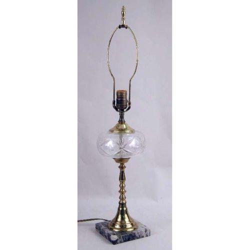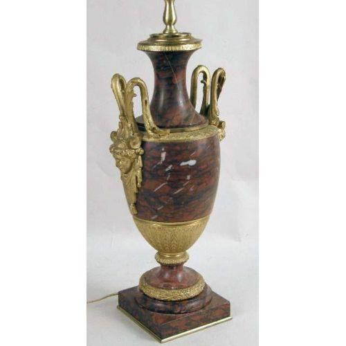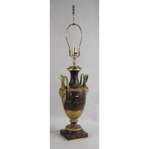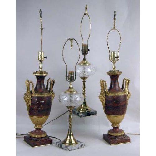 A PAIR OF LOUIS XVI STYLE GILT METAL MOUNTED URN FORM RED STONE URNS<BR><BR>Now fitted as lamps, 17"h. Together with a pair of brass and glass font fluid lamp style table lamps. with decorative cut paper shades, 18"h