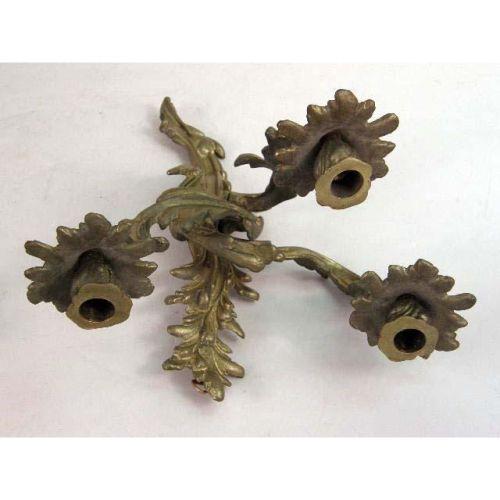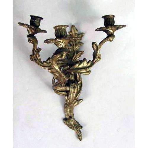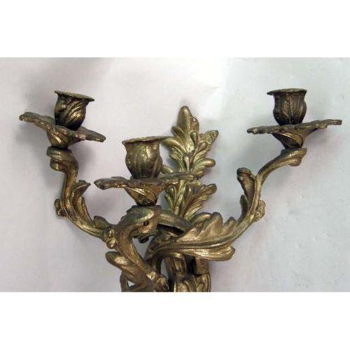 A PAIR OF LOUIS XVI STYLE GILT METAL THREE LIGHT WALL MOUNTED CANDLE SCONCES<BR><BR>15"h