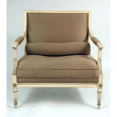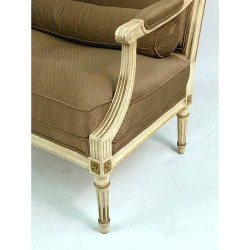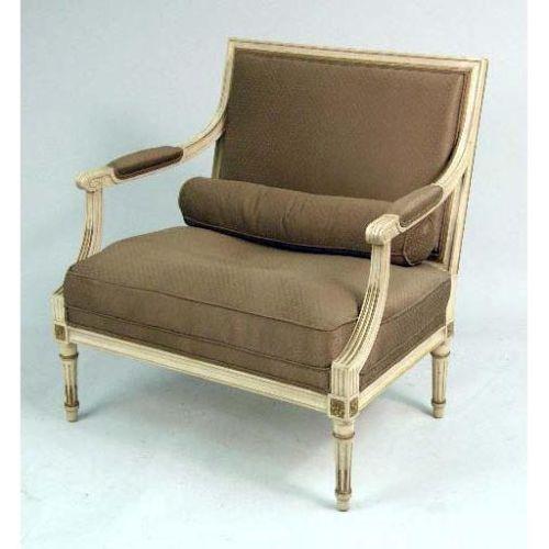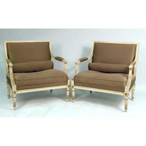 A PAIR OF LOUIS XVI STYLE PAINTED MARQUISES<BR><BR>Each with rectangular backrest, padded arms, upholstered seat and turned tapered stop-fluted legs