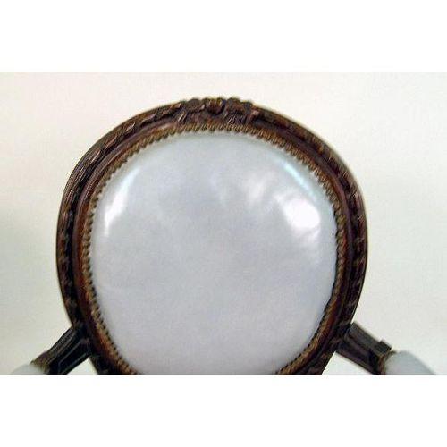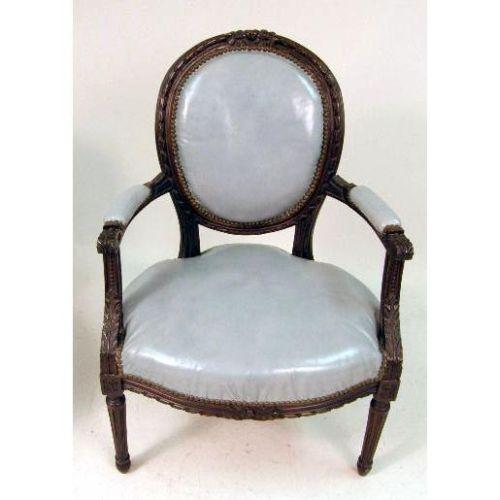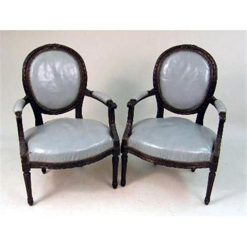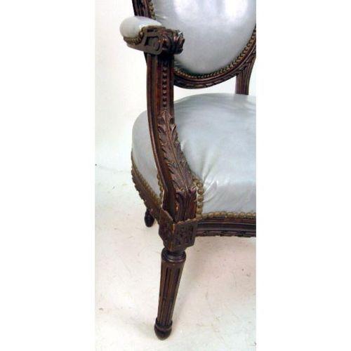 A PAIR OF LOUIS XVI STYLE WALNUT CARVED ARMCHAIRS<BR><BR>With light blue upholstery