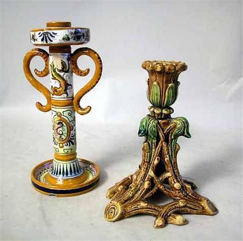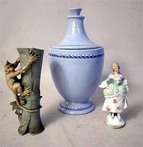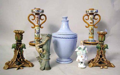 7 1/2"h. Together with three Italian table articles, a monkey vase, and a Colonial figurine. Chips, cracks, and losses.