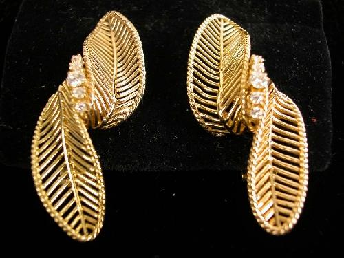 A PAIR OF MARIANNE OSTIER 18K YELLOW GOLD AND DIAMOND LEAF FORM EAR CLIPS; Open-work leaves in opposing directions, each set with five graduating diamonds, twisted rope border, marked with MO in lozenge and 18K, ensuite with the previous lot, 2-1/4"l in original fitted box A similar example Lot 283 Parke Bernet Nov 19, 20, 1969 "A Collection of Jewelry bt Marianne Ostier"