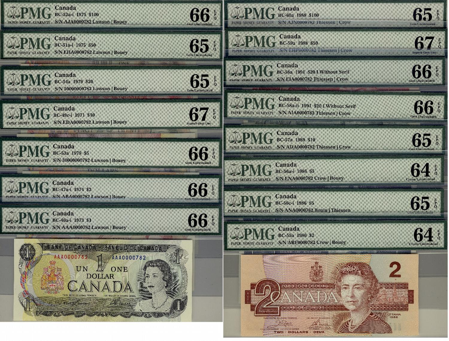 A PAIR OF MATCHED SETS:  1973 $1 BC-46a-i AAA0000782 Pmg UNC66 EPQ, 1974 $2 BC-47a-i /ABA0000782, 1979 $5 BC-53a /30000000782 PMG UNC66 EPQ, 1971 $10 BC-49c-i /EDA0000782 PMG UNC67 EPQ, 1979 $20 BC-54a 50000000782, PMG UNC65 EPQ, 1975 $50 BC-51a-i /EHA0000782 PMG UNC65 EPQ, 1975 $100 BC-52a-i /AJA0000782, PMG UNC66 EPQ, 1986 $2 BC-55a /ARF0000782, PMG UNC64 EPQ, 1986 $5 BC-56c-i, /ANA0000782, PMG UNC65 EPQ, 1986 $5 BC-56a-i /ENA0000782, PMG UNC64 EPQ, 1989 $10 BC-57a /ADA0000782, PMG UNC65 EPQ, 1991 $20 BC-58a-ii /AIA0000782 PMG UNC66 EPQ,1991 $20 BC-58a /EIA0000782, PMG UNC66 EPQ, 1988 $50 BC-59a /EHP0000782, PMG UNC67 EPQ, 1988 $100 BC-60a /AJN0000782, PMG UNC65 EPQ,