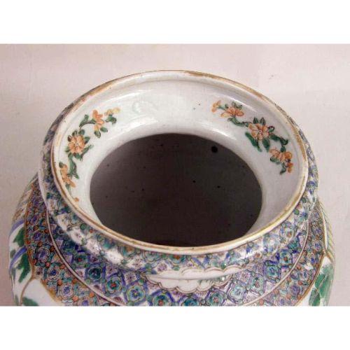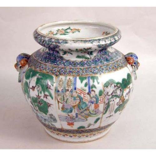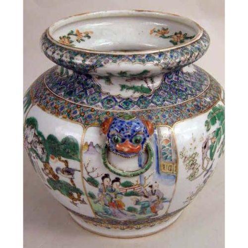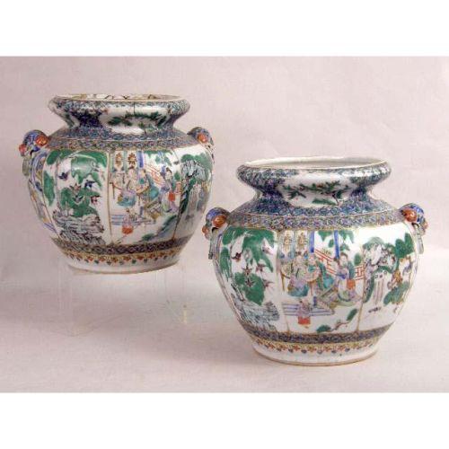 A PAIR OF MATCHING POLYCHROME PARCEL-GILT DECORATED PORCELAIN URNS<BR><BR>with Foo dog handles. Cracks, chips, and losses. 9"h