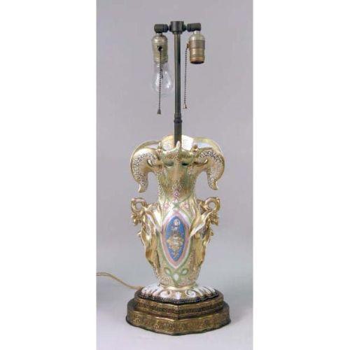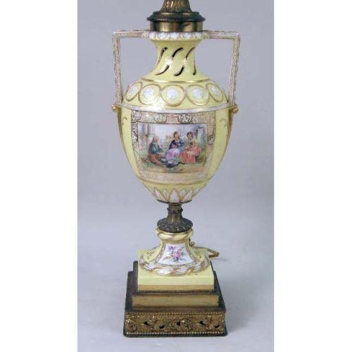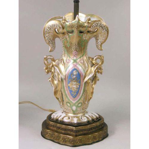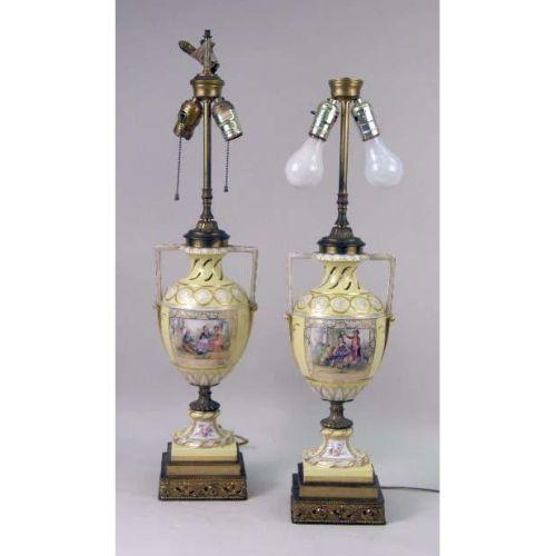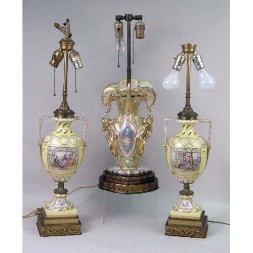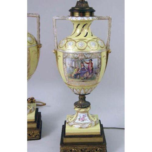 A PAIR OF MEISSEN STYLE YELLOW-GLAZED URNS<BR><BR>Mounted as lamps, 34"h. Together with a French Victorian gilt, green, and blue lily of the valley vase, mounted as a lamp 3 pieces