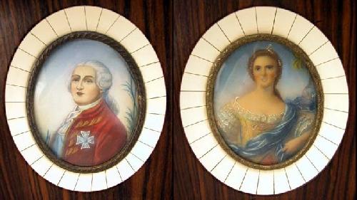 A PAIR OF MINIATURE PORTRAITS OF AN ELEGANT MAN AND WOMAN ON RESIN; 3"h x 2 1/2"w