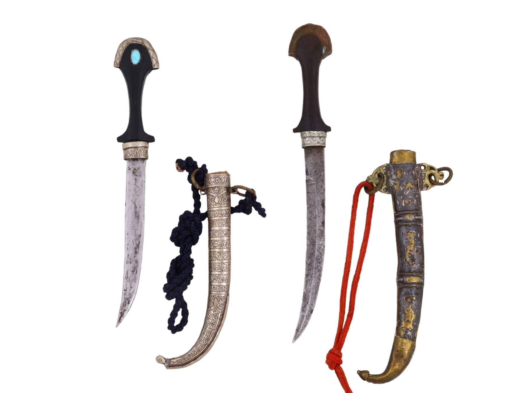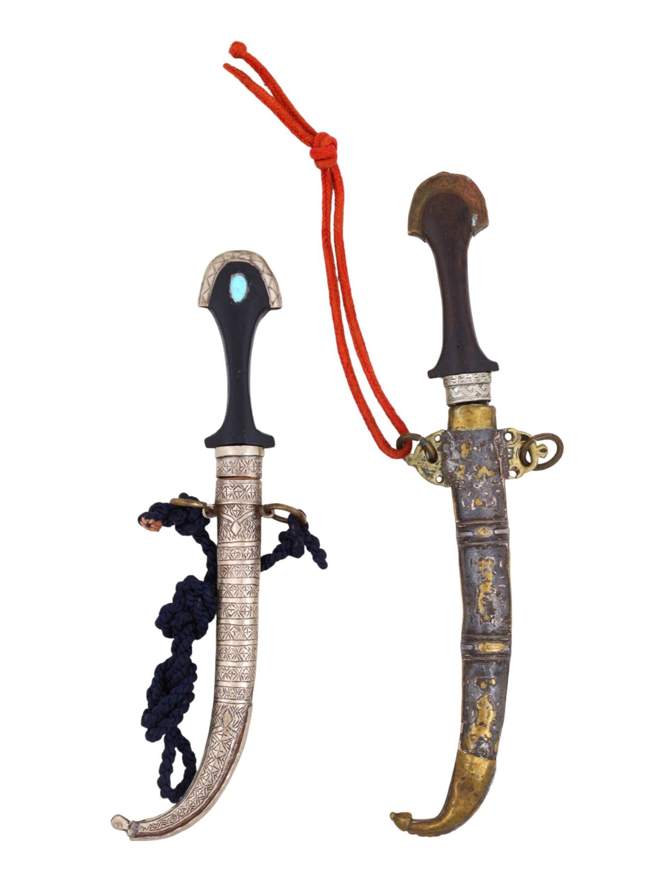 A pair of Moroccan Koummya daggers dating from the late 19th or early 20th century. Both having steel blades and horn grips, one of them having fittings on the grip and scabbard made primarily of brass and the other having fittings primarily of silver, decoratively embossed, and affixed with turquoise in the handle. Probably created by local craftstmen.
