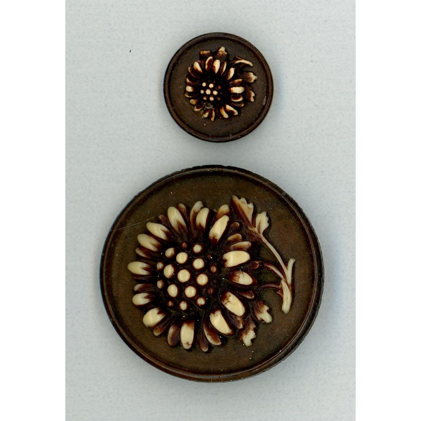 2 M/L 19th century wood buttons with Ivoroid flowers. This pair of Mother-Daughter buttons have Ivoroid (early celluloid) mum flowers that are screwed to the wood base. The large button has a self shank while the smaller example has a loop shank.