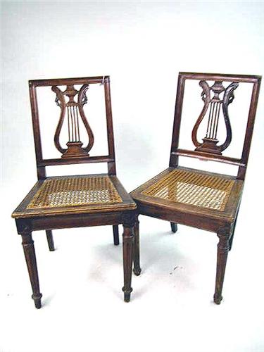 A PAIR OF NEOCLASSICAL CARVED WALNUT LYRE-BACK CANED SEAT SIDE CHAIRS; probably Italian, some wear and repairs