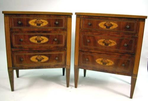 A PAIR OF NEOCLASSICAL INLAID MAHOGANY THREE DRAWER COMMODES; Of rectangular form with ovals inlaid with baskets of flowers on drawer fronts and toes, ending in tapering rectangular legs (some losses to inlay) 32"h x 26"w x 15 1/2"d