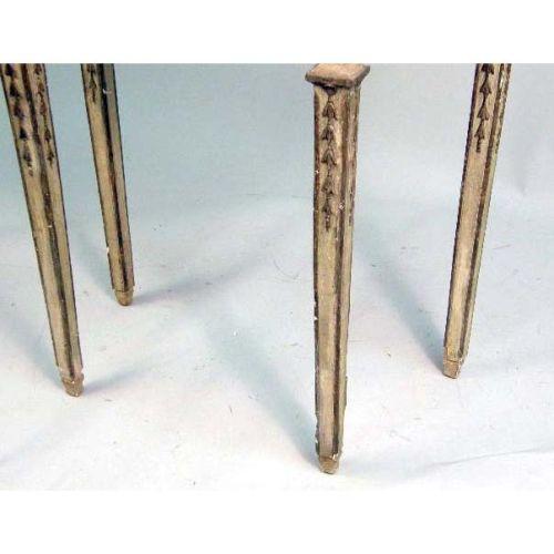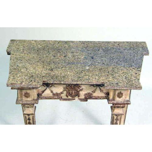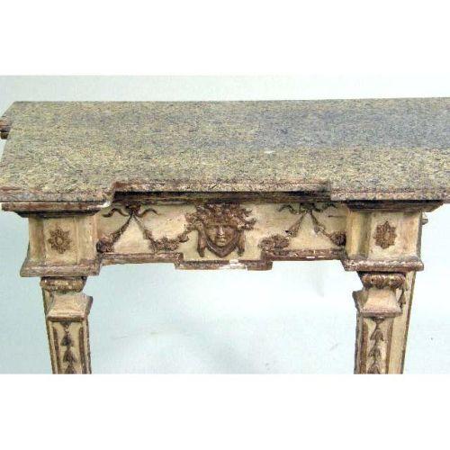 A PAIR OF NEOCLASSICAL PAINTED AND PARCEL-GILT CONSOLE TABLES<BR><BR>Continental, each with a veneered marble top, a conforming frieze centered at the front by a female mask showing foliage, tops not original, altered in size, 32"h x 31"w