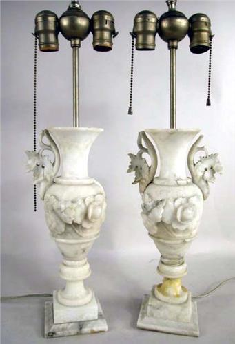 A PAIR OF NEOCLASSICAL STYLE ALABASTER URN-FORM LAMPS; (losses) 26"h