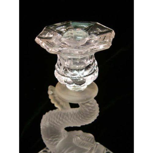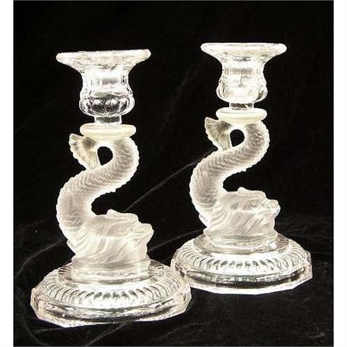 A PAIR OF NEOCLASSICAL STYLE FROSTED TO CLEAR GLASS DOLPHIN-FORM CANDLESTICKS<BR><BR>Chips, 8"h