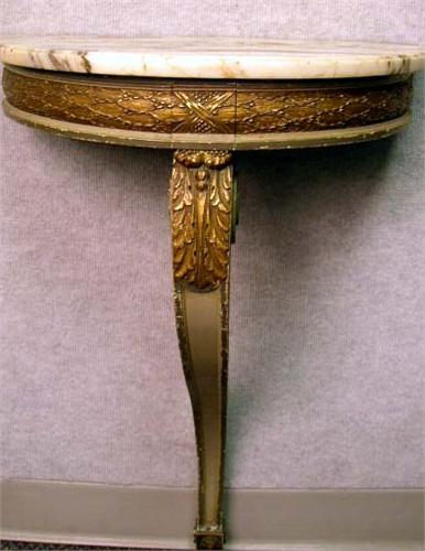 A PAIR OF NEOCLASSICAL STYLE MARBLE TOP CONSOLE TABLES; each with a demilune top, carved apron and cabriole leg on a peg foot. 30"h x 20"w x 10 1/2"d