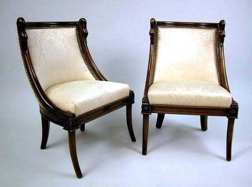 A PAIR OF NEOCLASSICAL SWAN-CARVED MAHOGANIZED SLIPPER CHAIRS; The curved backs flanked by stiles surmounted with preening swan's heads, the removable slip seat below above a floral decorated frieze, ending on frontal turned sabre-legs, restored, 27"h