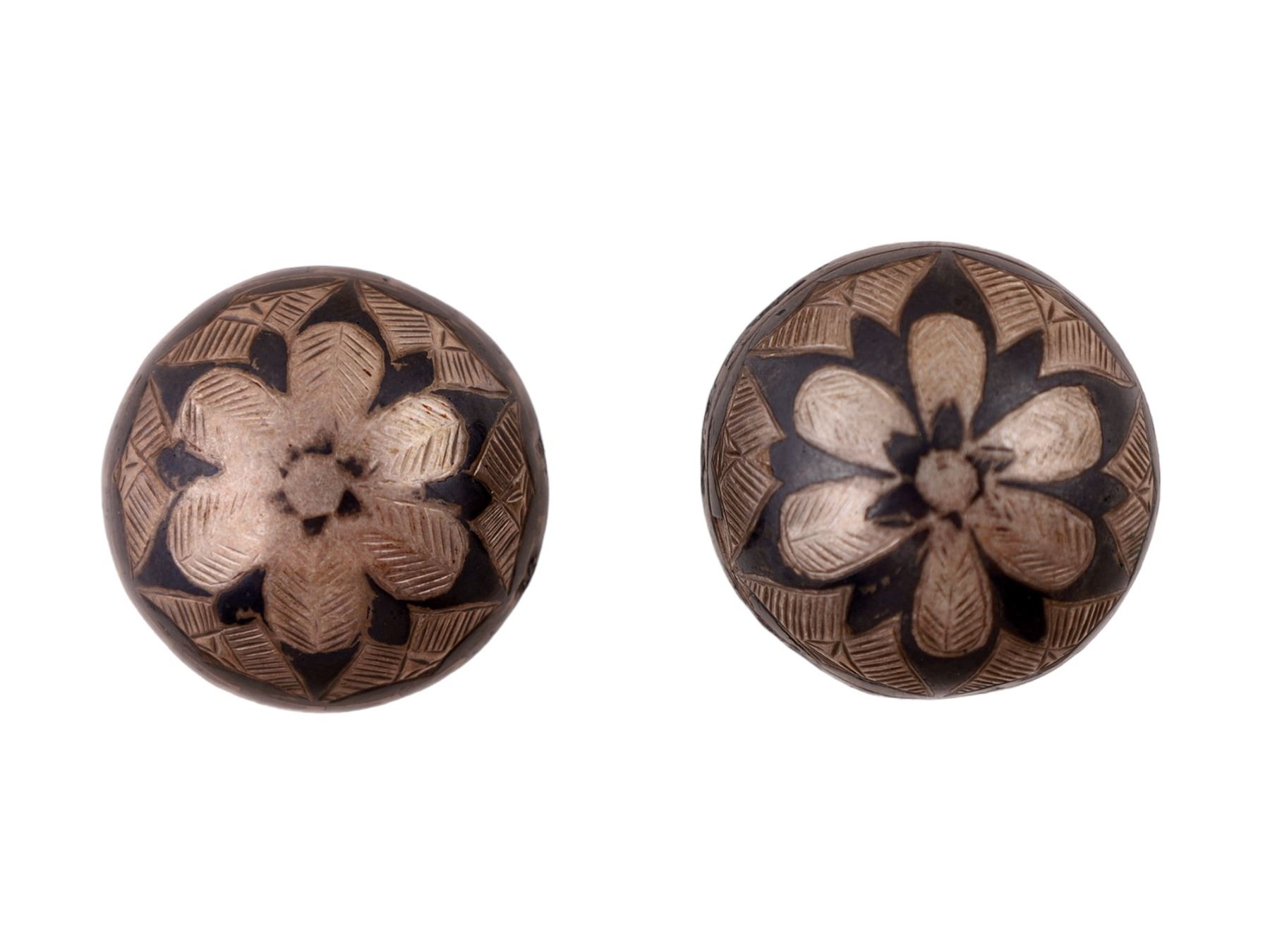 A pair of Caucasian Niello and Silver buttons from the 19th century with engraved floral motifs.