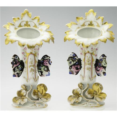 <B>A PAIR OF PORCELAIN TRUMPET VASES</B></I><BR>Old Paris, c.1900<BR><BR>The art nouveau design over soft paste porcelain with gilt highlights, hand painted pink roses and two multi-colored butterflies, unmarked<BR>2 Items <BR><BR><B>Condition Report:</B> Gilt worn in areas, chip to one petal of trumpeted rim, re-fired