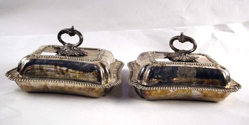 A PAIR OF OLD SHEFFIELD PLATE COVERED VEGETABLE DISHES; Crested, 4 1/2"h x 12"w x 9"d