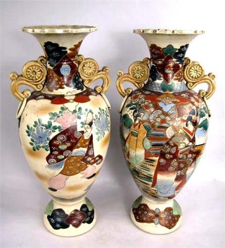 A PAIR OF ORIENTAL STYLE DOUBLE HANDLED VASES; Depicting geisha girls, 25"h