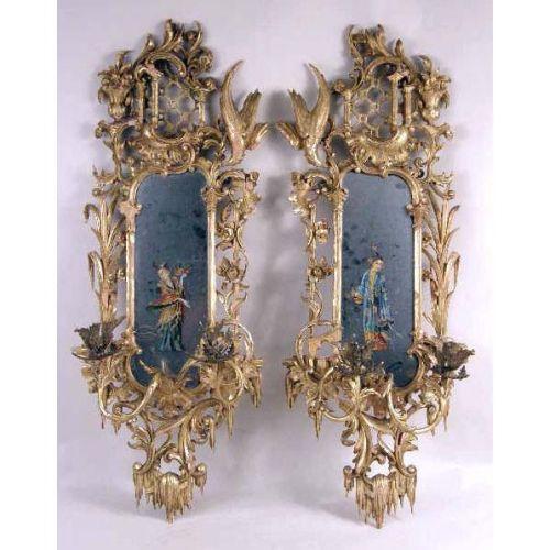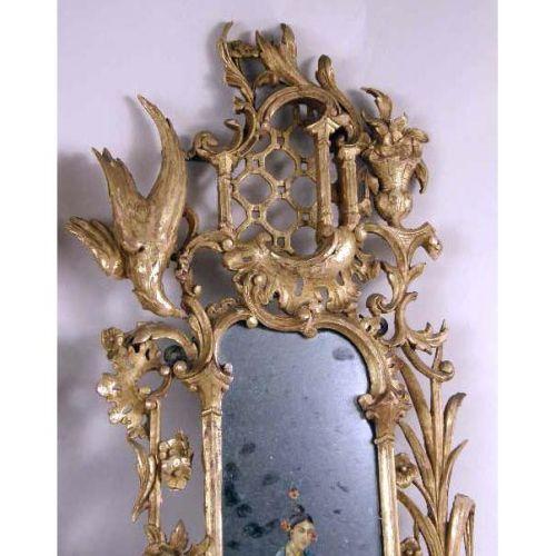 A PAIR OF ORIENTAL STYLE PIERCED CARVED GILT WOOD WALL MIRRORS<BR><BR>With foliate and bird carvings, some damage, 33"h x 10"w