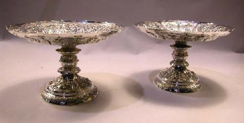 A PAIR OF ORNATE ENGLISH STERLING SILVER TAZZAS; Hallmarked Sheffield, 1886, heavily chased floral motif bowls and standards, central crested with motto "Oportet Vivere", 5-3/4"h x 9"dia., apx. 41 T.O.