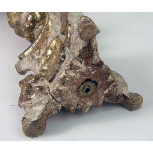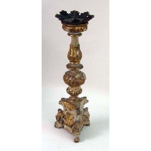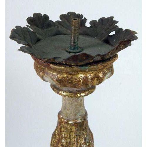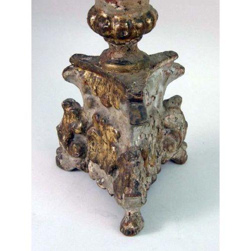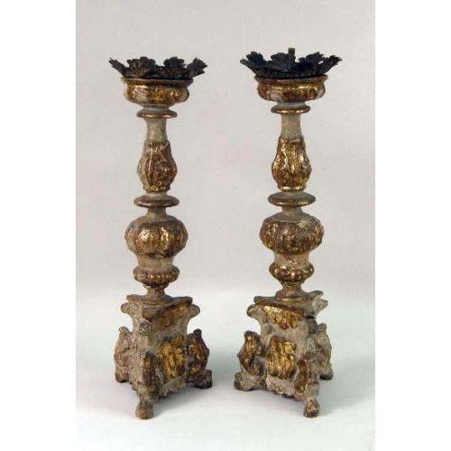 A PAIR OF PAINTED AND PARCEL-GILT PRICKET CANDLESTICKS<BR><BR>Italian, with turned bulbous stems and concave-sided triangular bases, on hoof feet, 20"h