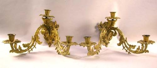 A PAIR OF PATINATED METAL THREE LIGHT WALL SCONCES; 17" x 12" x 14"
