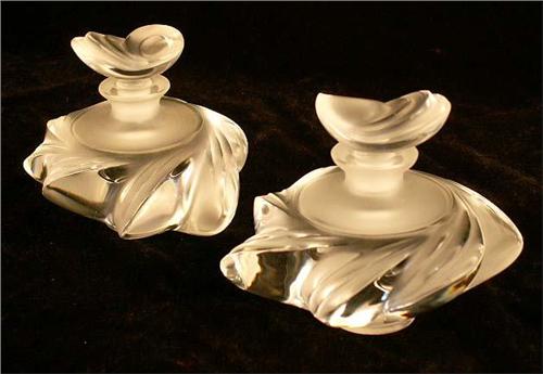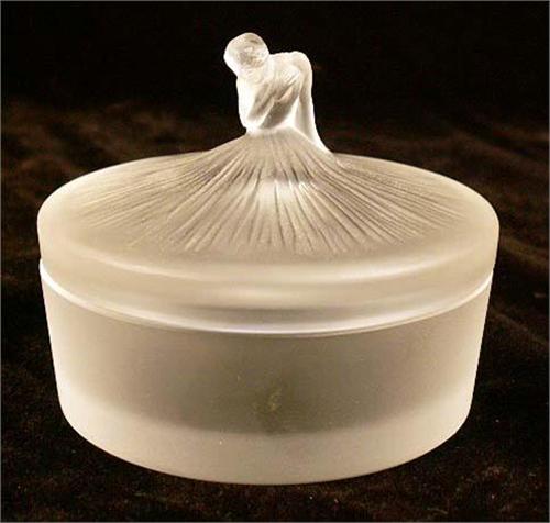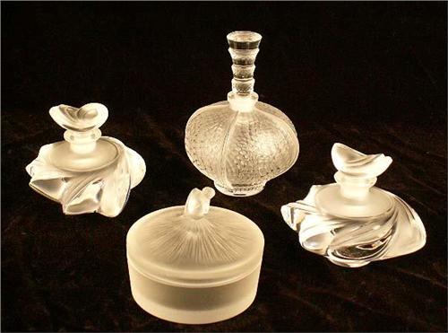 Signed Lalique, France, 3"h. Together with a Lalique Society of America powder box, and a Lalique perfume bottle with stopper, 4 3/4"h