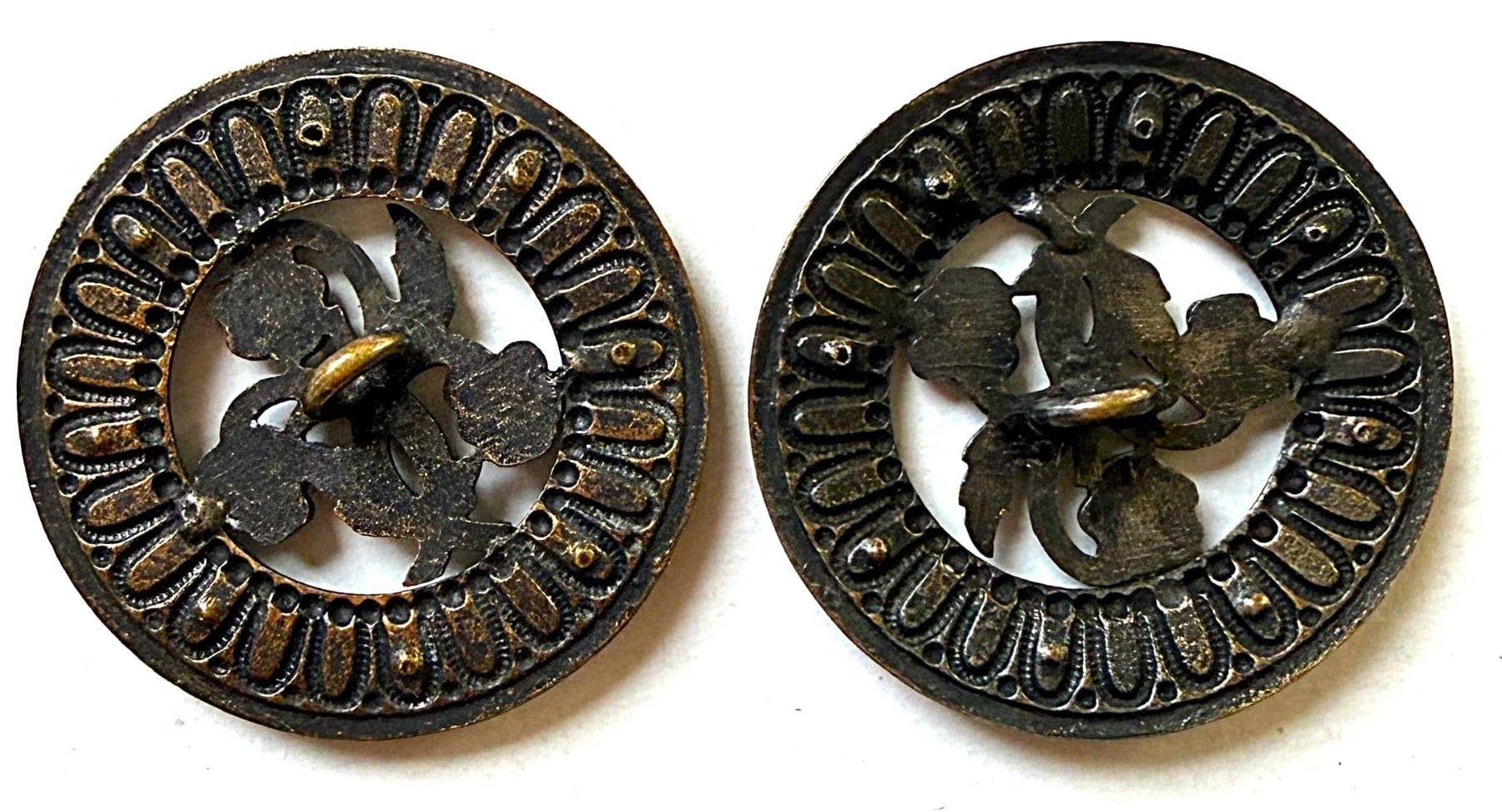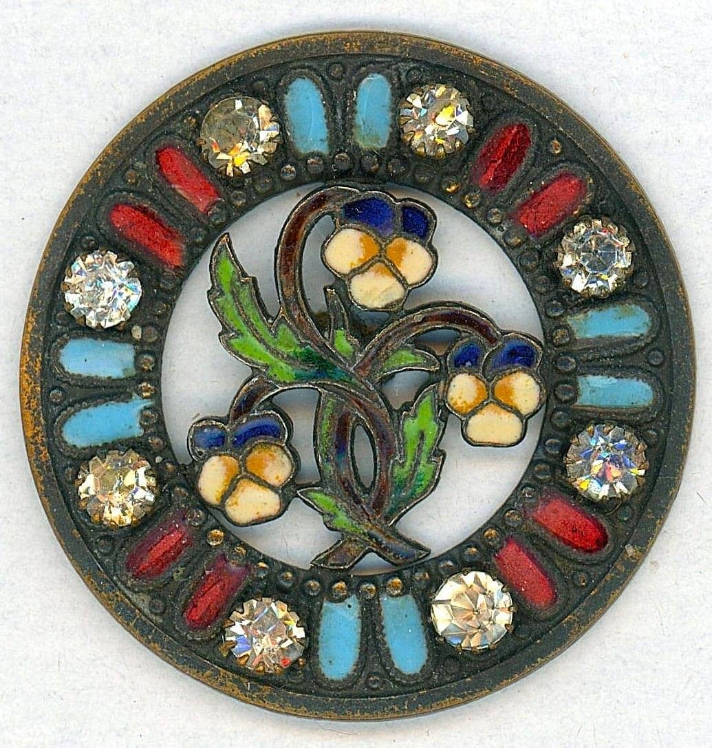 2 Large pierced buttons with enamel with ornate borders. Here are two very wonderful floral buttons of PANSIES in Art Nouveau style and in colorful enamel work in the center and bordered with coral colored and turquoise colored glass and brilliant clear pastes. Truly exquisite examples.
