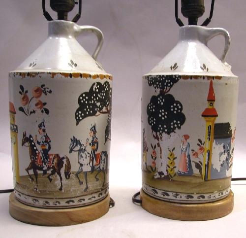 A PAIR OF POLYCHROME-DECORATED STONEWARE JUG LAMPS; 14"h