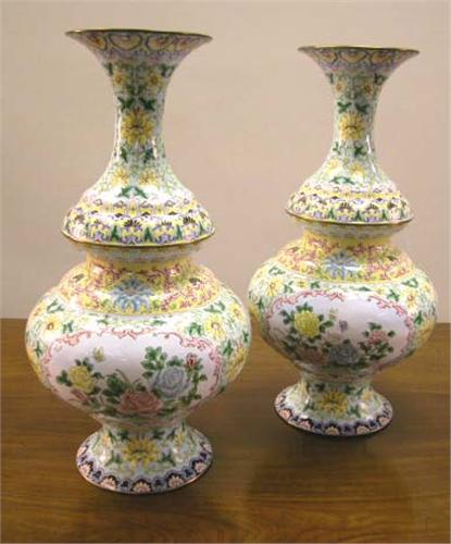 A PAIR OF POLYCHROME-DECORATED URNS; Done in tones of yellow, blue and green, 18"d