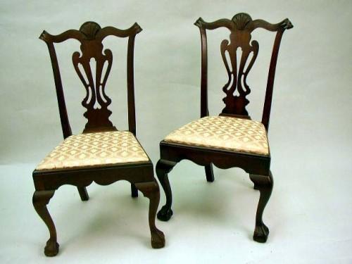 A PAIR OF QUEEN ANNE STYLE CARVED WALNUT SIDE CHAIRS; In the Pennsylvania tradition, each with a shell-carved crest, scrolled ears, strapwork splat, cabriole legs, and claw-and-ball feet