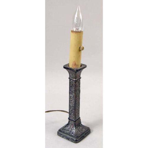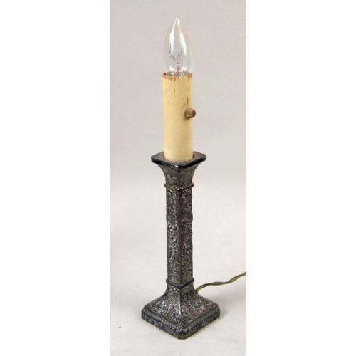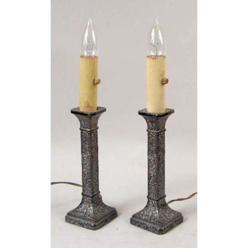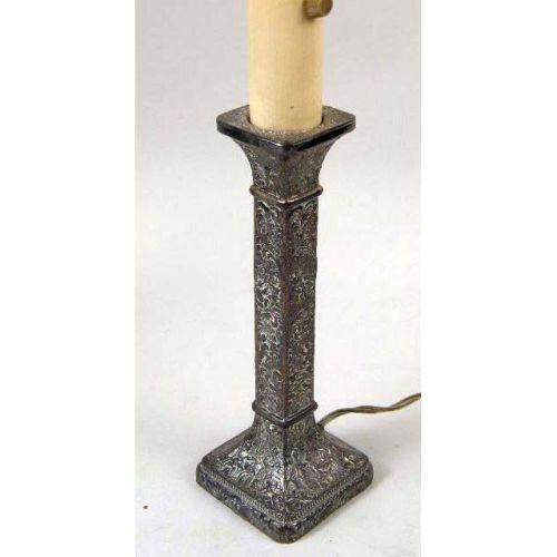 A PAIR OF REPOUSSE SILVERED-METAL CANDLESTICK-FORM DRESSING TABLE LAMPS<BR><BR>16"h, including shade