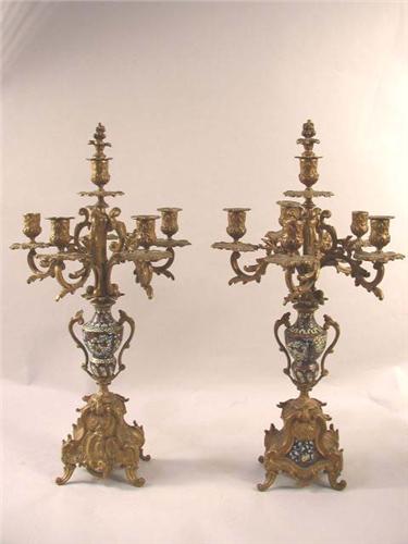 A PAIR OF ROCOCO REVIVAL STYLE AND ENAMEL GILT DECORATED SIX LIGHT CANDELABRA; Central raised candle socket above five scrolling arms with urn form support on scroll feet, 26" h x 13"d lacking some bobeches