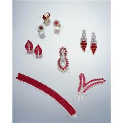 <b>Description: </b>each designed as a leaf with tapering baguette-cut diamonds central vein to the calibré-cut rubies, signed Sabbadini