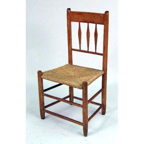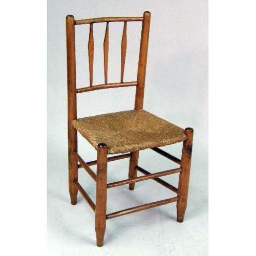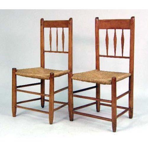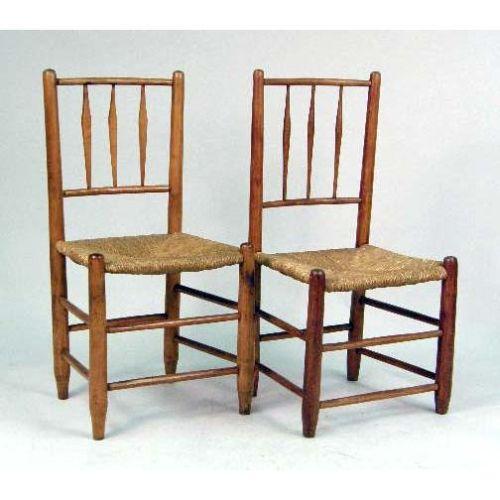 A PAIR OF RUSH-SEAT SPINDLE-BACK SIDE CHAIRS<BR><BR>together with two similar chairs, one with a green velour cushion. Spindle-backs each 34" h x 14 1/2" w x 14" d. 4 pieces.
