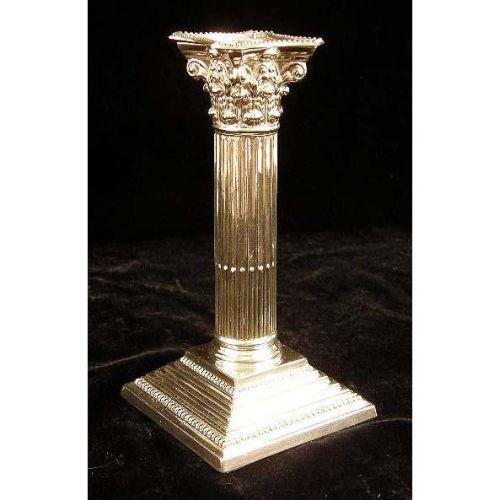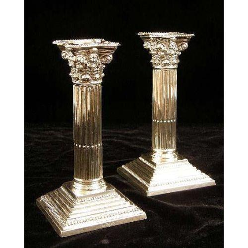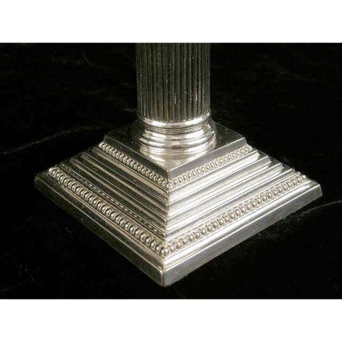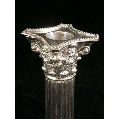 A PAIR OF SILVER PLATED COLUMNAR CANDLESTICKS<BR><BR>With removeable bobeche, beaded border, 7"high
