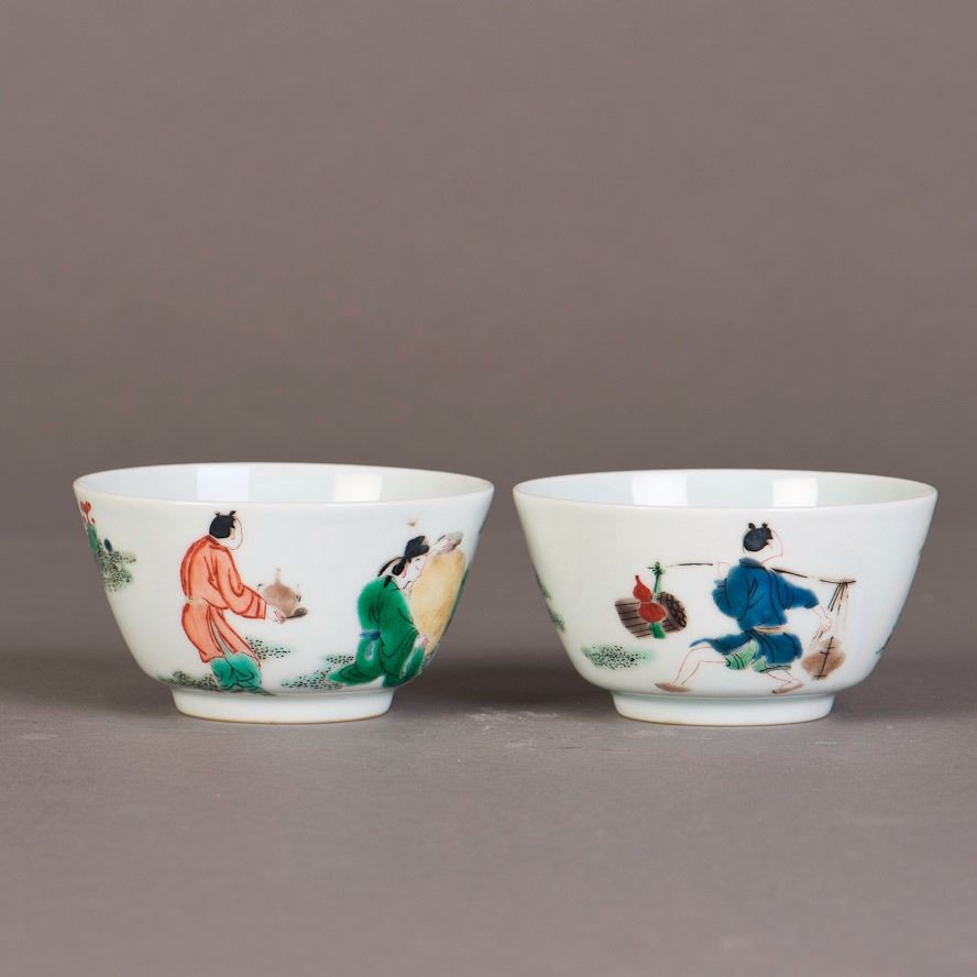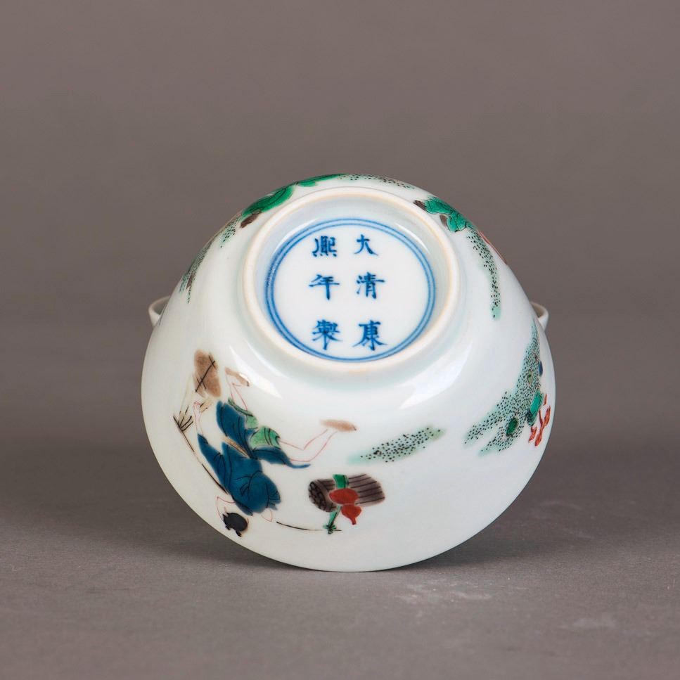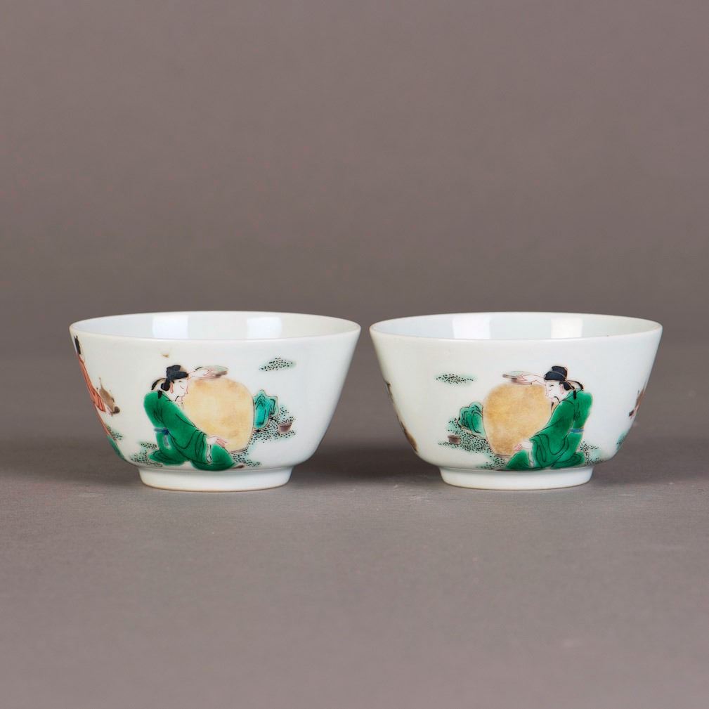 A pair of famille rose porcelain bowls featuring painting of scholars on the exterior, bearing a six-character seal on the base. Height 1.75" Width 3.25"
